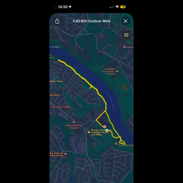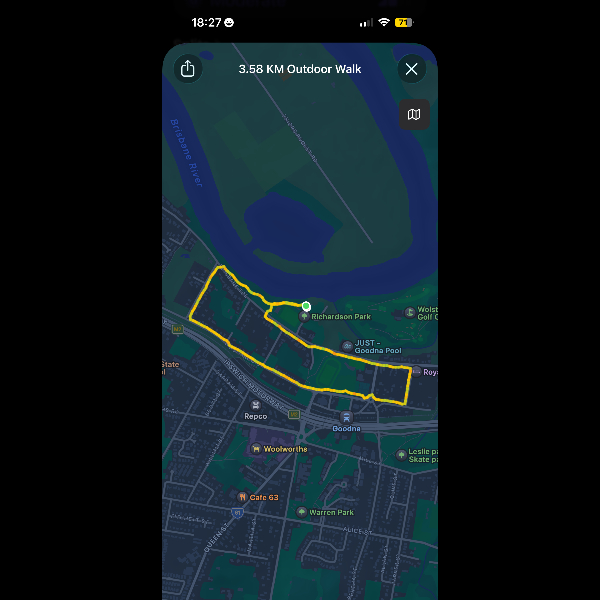 Tuesday 24th Mar Today's walk led me to the riverfront park walk at Goodna. Completed 3.58km in 0:51:59.